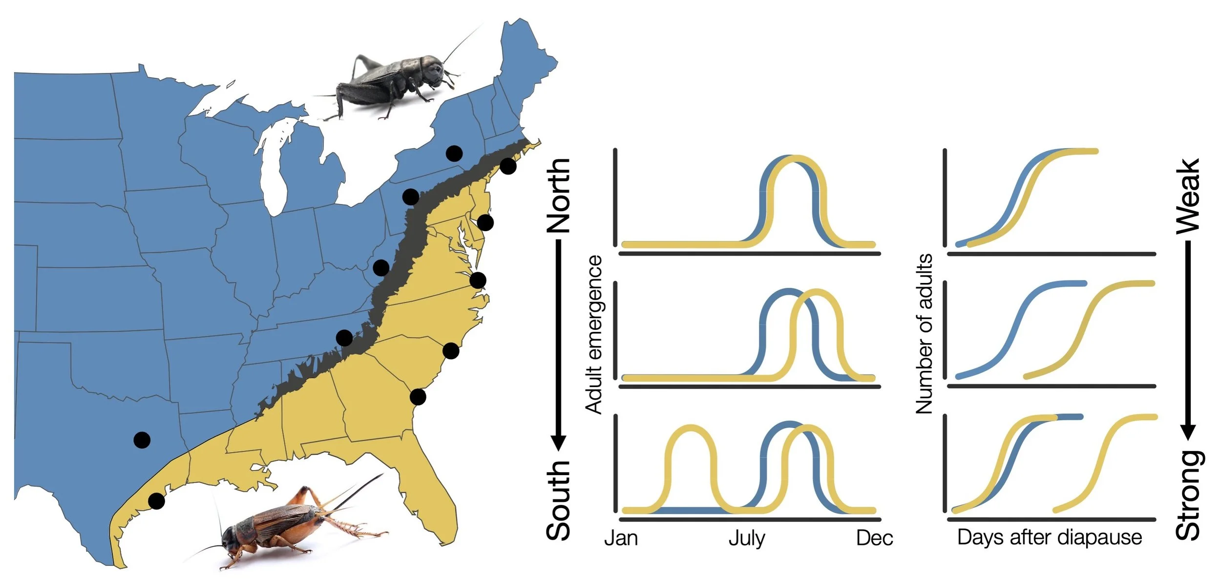 While global climate change presents a threat to biodiversity, these fluctuations in climate can also offer new opportunities to study outstanding questions in evolution and speciation, especially over rapid timescales. How species are responding to the contrasting selection pressures imposed by climate change and phenological mismatches via phenotypic plasticity or rapid evolutionary adaptation remains an open question. We are currently using an integrative genotype-phenotype-environment approach across the latitudinal range of the field cricket hybrid zone to determine how variability of seasonal life history traits (e.g., diapause and development) in response to a changing climate affect the persistence, formation, and/or collapse of temporal species boundaries.